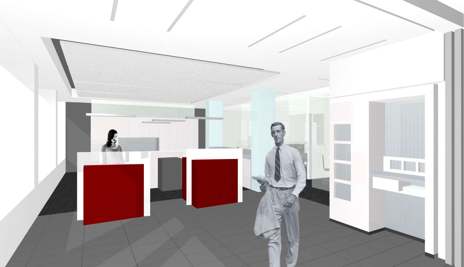 Die in die Jahre gekommene Geschäftsstelle wurde unterteilt und die nicht mehr benötigte Fläche in eine vermietbare Gewerbefläche umgewandelt. Die neu errichteten Sparkassenräume erscheinen in einer schlichten Eleganz mit reduzierten Materialien. Einige Farbflächen und die Bilder von Birgit Grabow setzen spannende Akzente. Die Bedruckungen der Glasscheiben orientieren sich an der Plastik „Mae West“ am nahe gelegenen Effnerplatz.